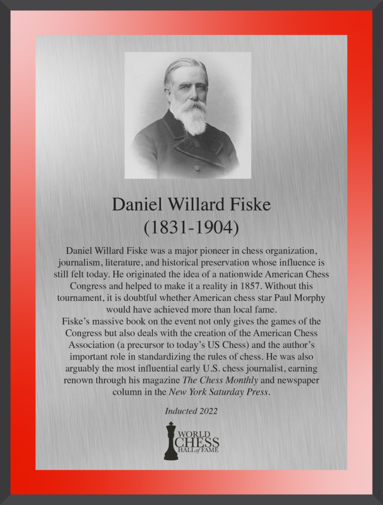 Daniel Willard Fiske was a major pioneer in chess organization, journalism, literature, and historical preservation whose influence is still felt today. He originated the idea of a nationwide American Chess Congress and helped to make it a reality in 1857. Without this tournament, it is doubtful whether American chess star Paul Morphy would have achieved more than local fame. Fiske’s massive book on the event not only gives the games of the Congress but also deals with the creation of the American Chess Association (a precursor to today’s US Chess) and the author’s important role in standardizing the rules of chess. He was also arguably the most influential early U.S. chess journalist, earning renown through his magazine The Chess Monthly and newspaper column in the New York Saturday Press.