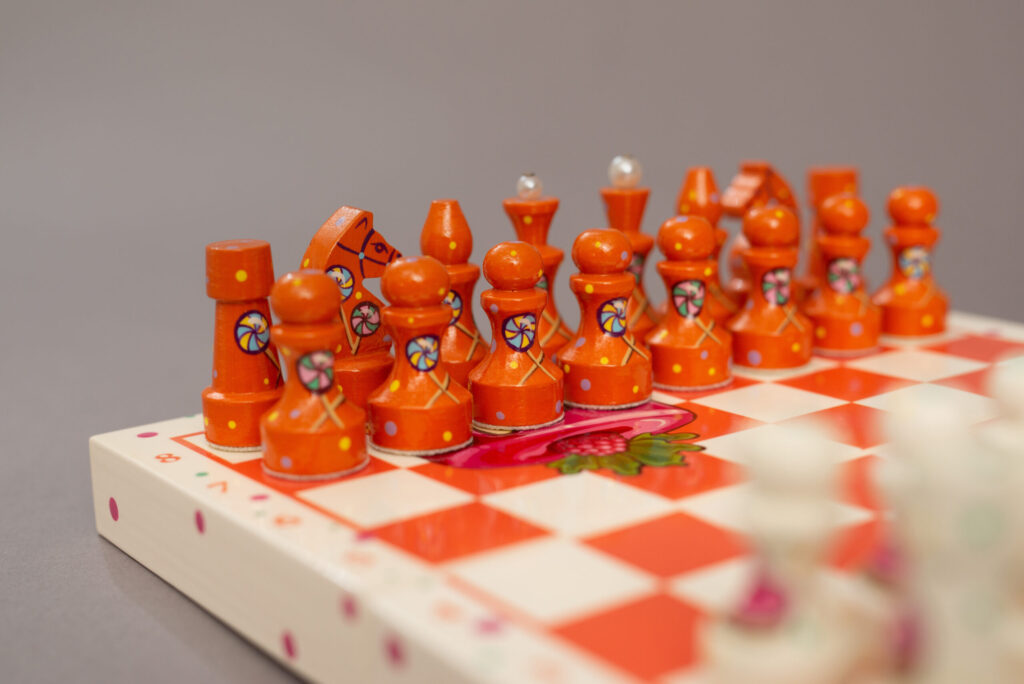 February’s Featured Chess Set is part of the collection of the World Chess Hall of Fame (WCHOF). Since its creation in 1986, the WCHOF has endeavored to highlight the history and cultural significance of the game of chess. The WCHOF’s collection is diverse and includes sets once owned by legendary players, mass-produced sets with lively pop culture themes, antique ivory sets, travel sets, as well as chess computers. Through these artifacts, the WCHOF illustrates how chess has evolved through its over 1500-year history. This set is a generous donation to the World Chess Hall of Fame from Nina Tsypina.